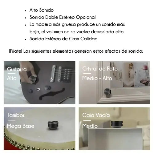 2. Sonidos distintos con diferentes superficies: Este altavoz utiliza tecnología de conducción ósea para ofrecerte una experiencia de sonido personalizada. Puedes probar y disfrutar diferentes sonidos, casi como si estuvieras usando distintos instrumentos. Colocarlo sobre superficies como vasos, guitarras, cajas de cartón kraft, cajas plásticas, marcos de fotos, auriculares deportivos o incluso tableros de autos te permitirá obtener una variedad de efectos sonoros.
